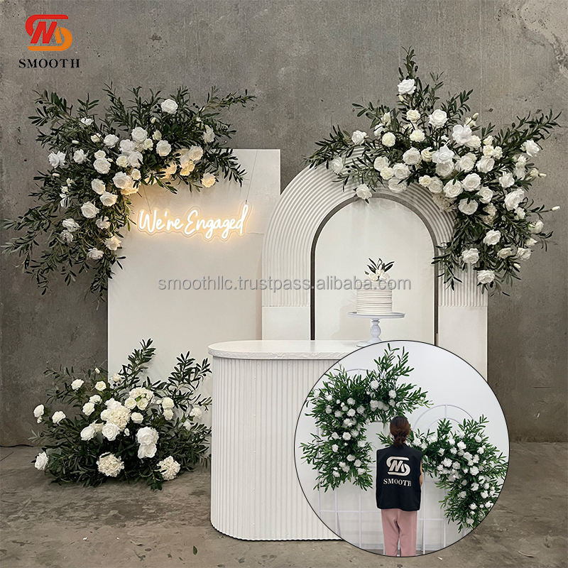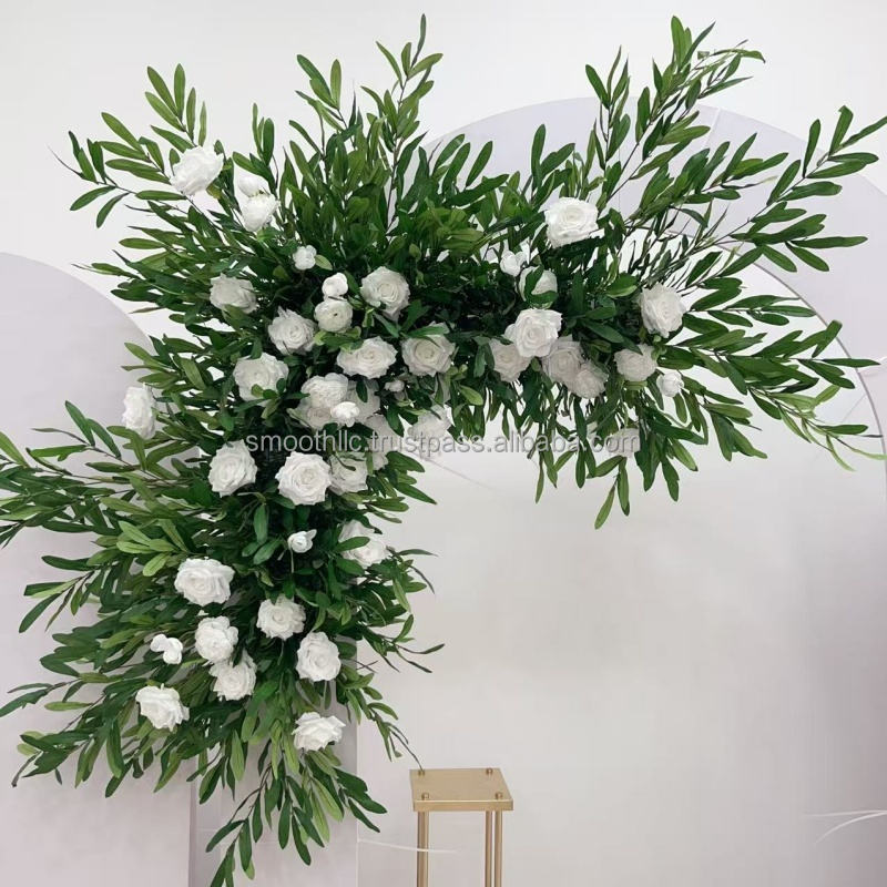 การตกแต่งเหตุการณ์ที่ราบรื่นดอกไม้ประดิษฐ์กุหลาบขาวและใบไม้สีเขียวแขวนแถวดอกไม้สำหรับตกแต่งฉากหลังแต่งงาน