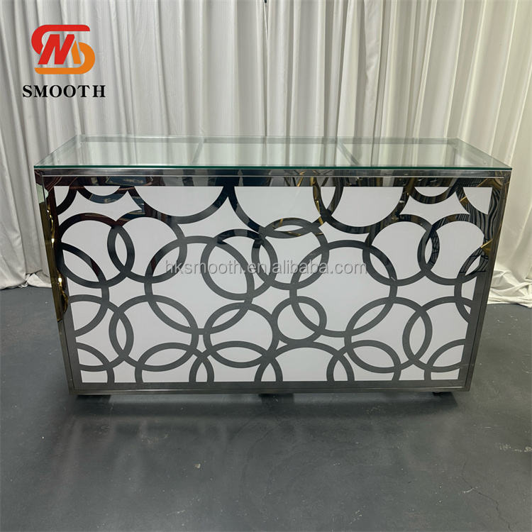 โต๊ะกระจกหน้าเรียบพร้อมฐานสแตนเลสสำหรับงานแต่งงาน โครงสแตนเลสทรงกลมสำหรับวางเค้กแต่งงาน
