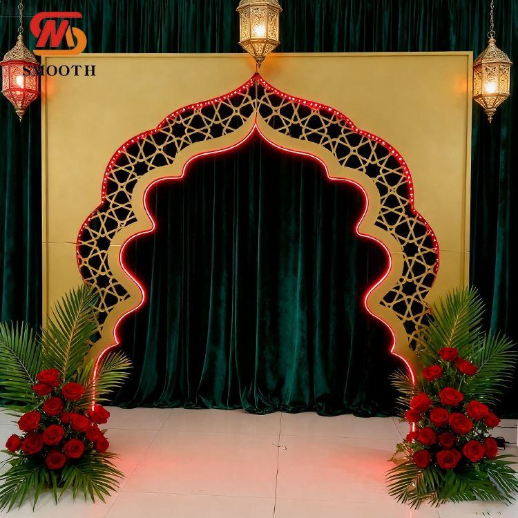 การตกแต่งพื้นหลังสไตล์พระราชวังโลหะสีทองเรียบการตกแต่งพื้นหลังซุ้มงานแต่งงานแบบอิสลามฉากหลังงานแต่งงานแบบอินเดีย