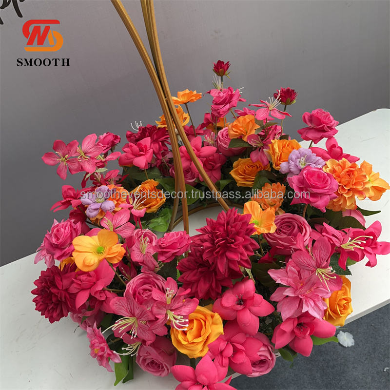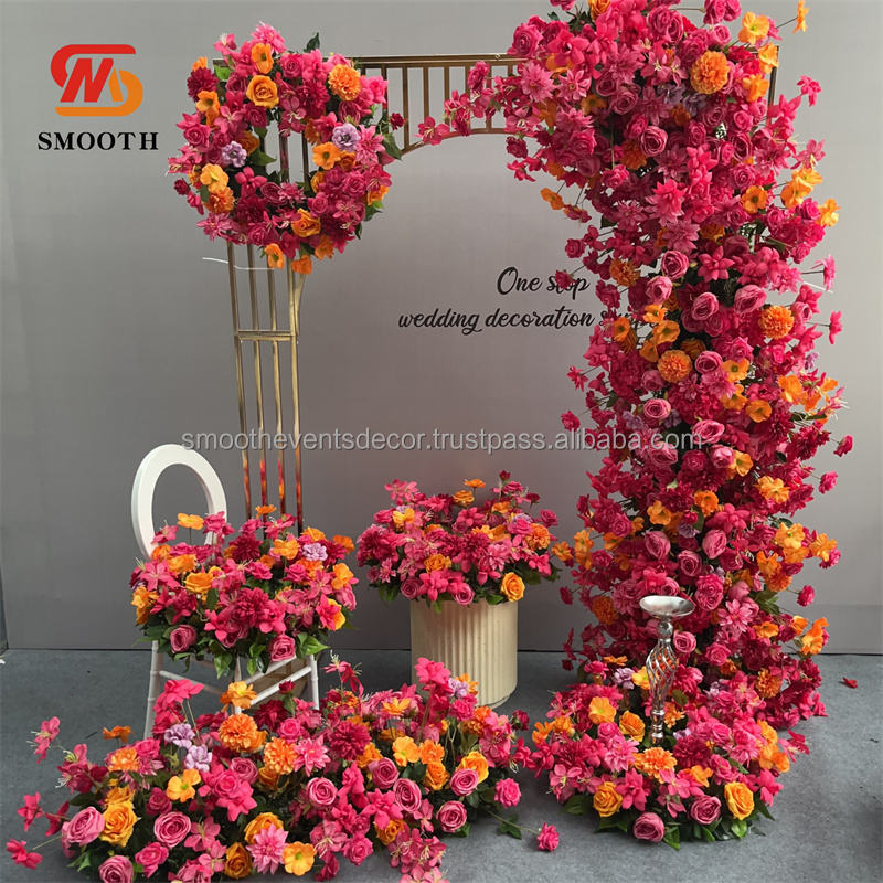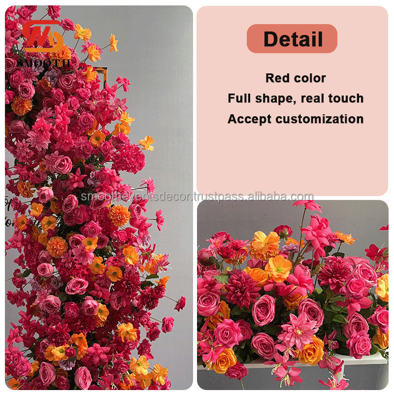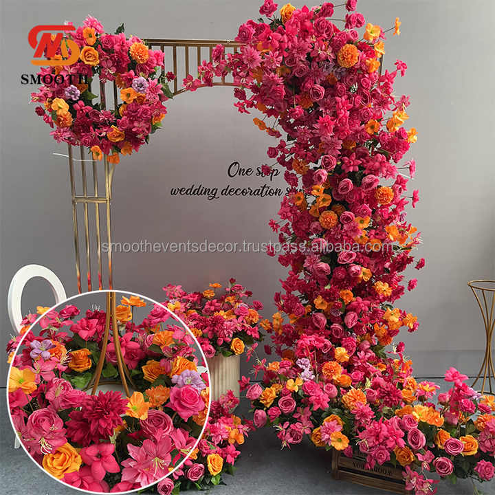 ดอกไม้ยาวเรียบสีชมพูร้อนกลางโต๊ะผ้าไหมสำหรับงานแต่งงานฉากหลังของตกแต่งดอกไม้