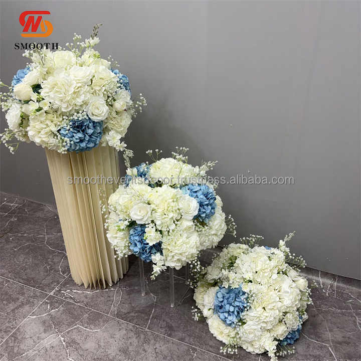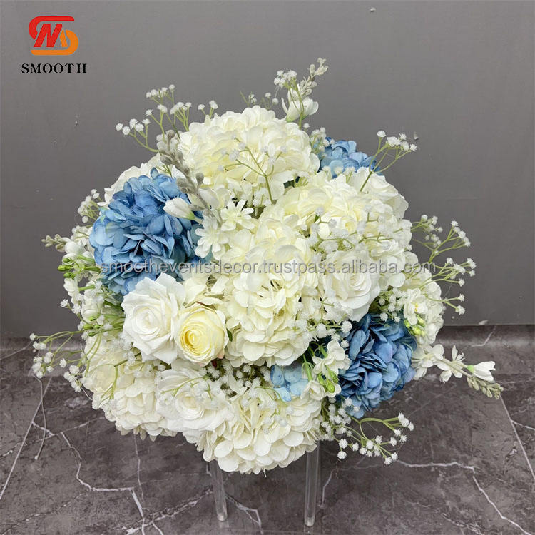 โต๊ะจัดงานแต่งงานทำจากดอกไฮเดรนเยียที่วางตรงกลางโต๊ะดอกไม้ประดิษฐ์สีฟ้าเรียบหรูหราปรับแต่งได้