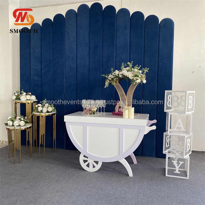 รถเข็นขนมหวานอะคริลิคสีขาวดีไซน์ใหม่ทันสมัย ตกแต่งงานปาร์ตี้หลากสีสัน