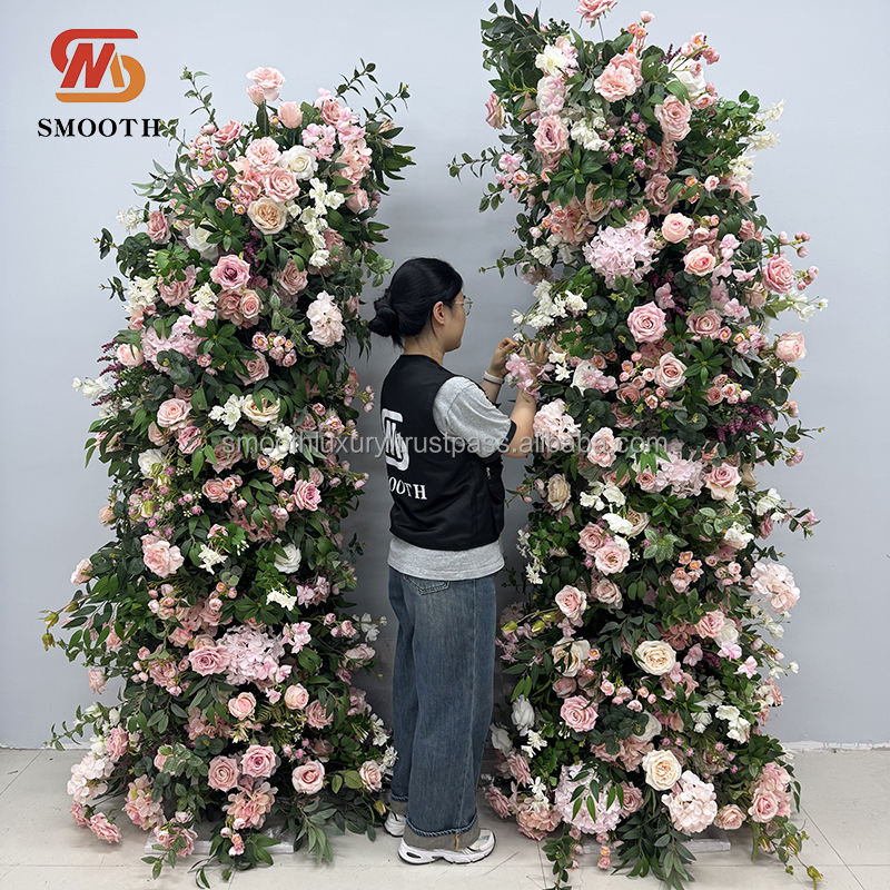 แท่นซุ้มดอกไม้ประดิษฐ์สีชมพูสีเขียวแบบสัมผัสที่แท้จริงเรียบการจัดดอกไม้โค้งสำหรับตกแต่งฉากหลังแต่งงาน5D