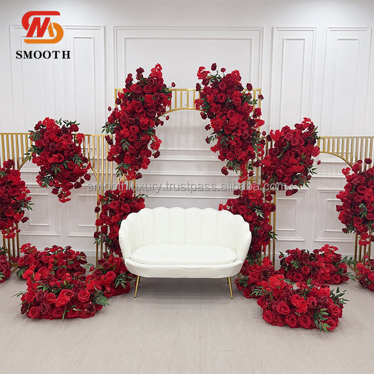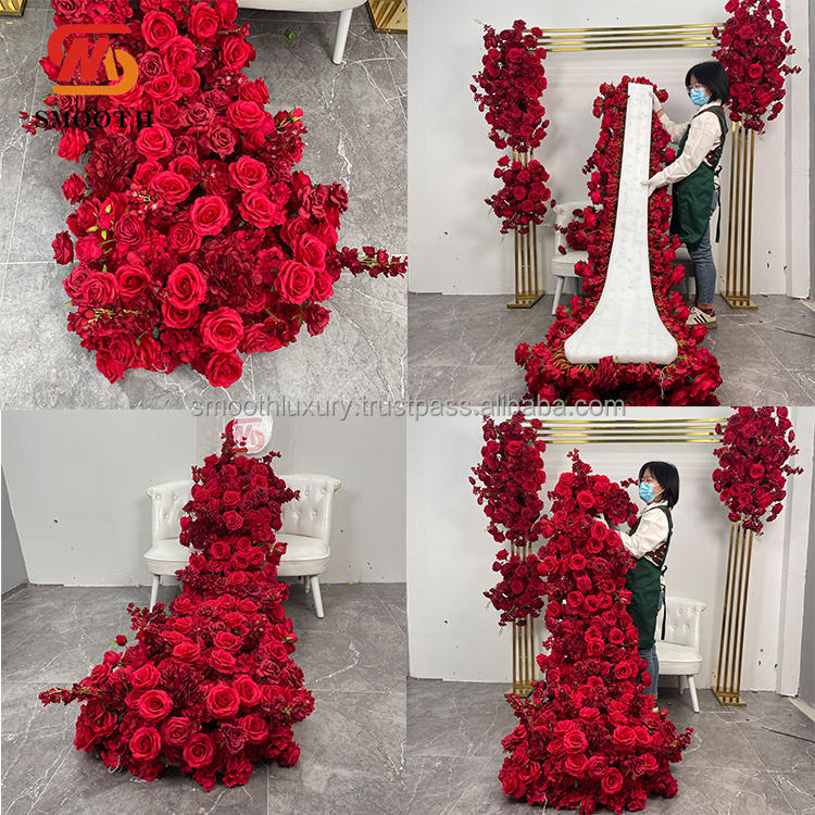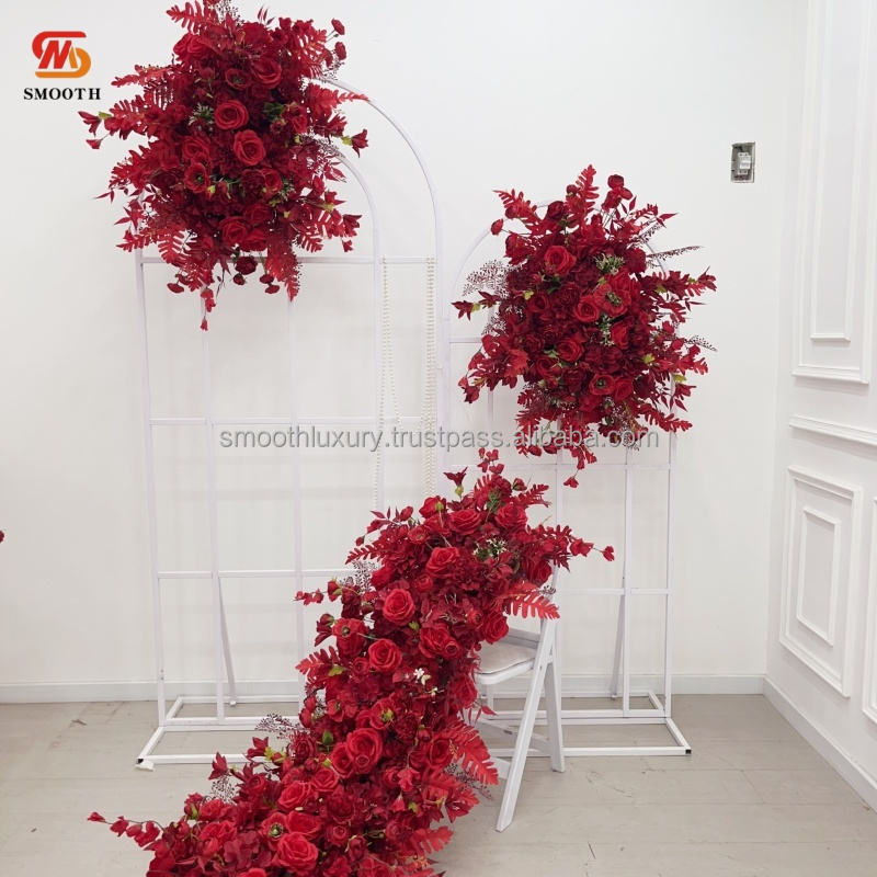 ชุดรูปแบบดอกไม้สีแดงเรียบย้อยสำหรับซุ้มงานแต่งงานพร้อมดอกไม้นักวิ่งการจัดดอกไม้สีแดง