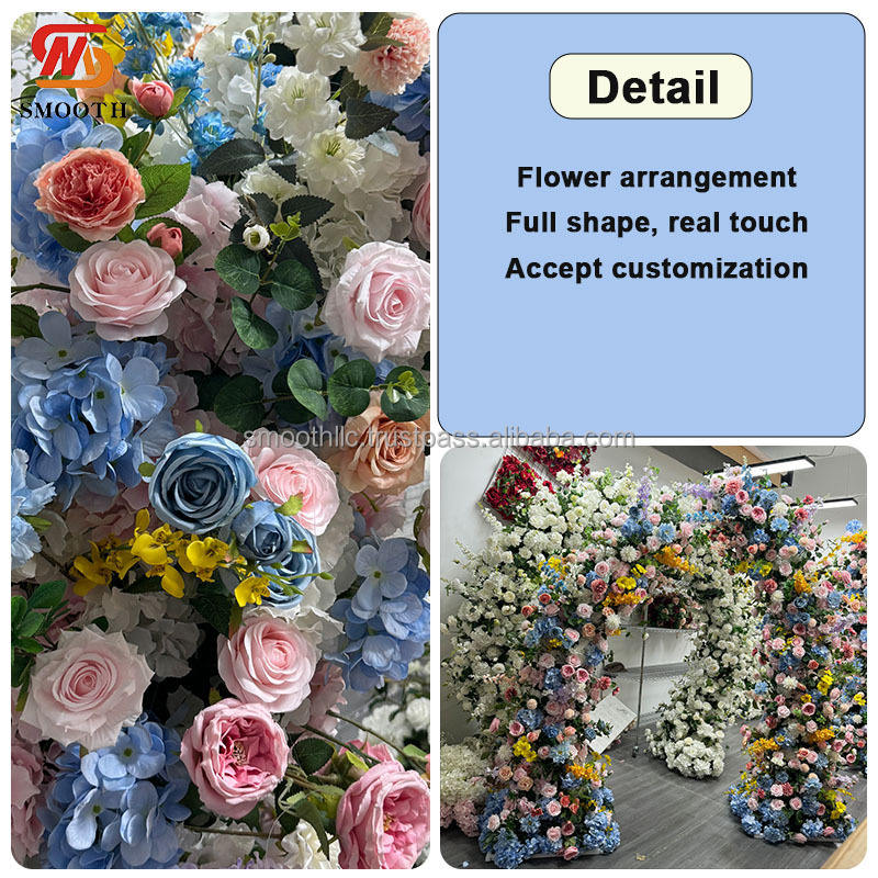 ซุ้มดอกไม้ผ้าไหมสีฟ้าตกแต่งทางเดินในพิธีแต่งงานที่ราบรื่น