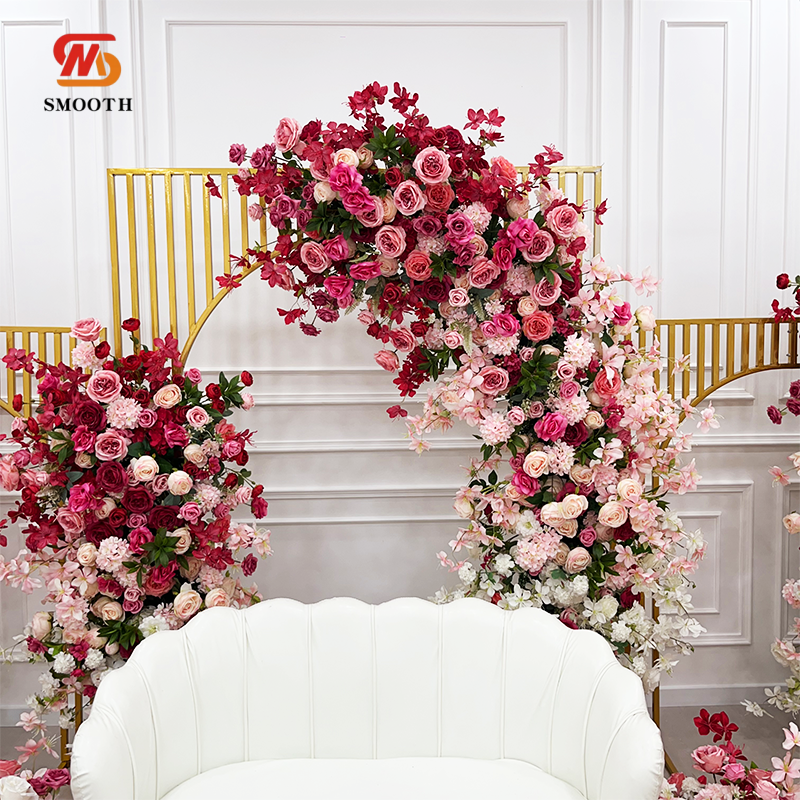 พรมปูพื้นสำหรับตกแต่งงานแต่งงานแบบเรียบการจัดดอกไม้ทำมือตรงกลางเวทีสีชมพูแดง