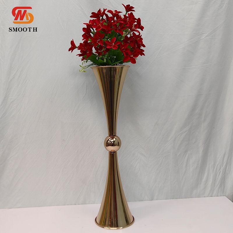 แท่นวางดอกไม้ทำจากโลหะสีทองแจกันทรงทรัมเป็ตสำหรับจัดงานแต่งงาน
