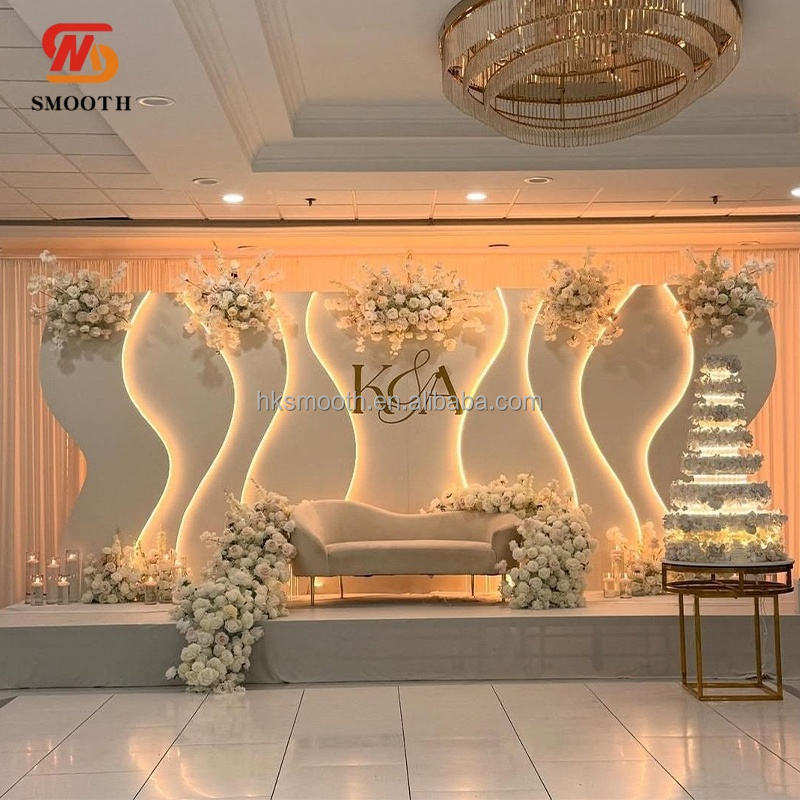 ฉากหลังงานแต่งงานแบบเรียบหรู ตกแต่งด้วยซุ้มอะคริลิคสีขาว รูปทรงคลื่นหลายชั้น สำหรับตกแต่งฉากหลังงานแต่งงาน