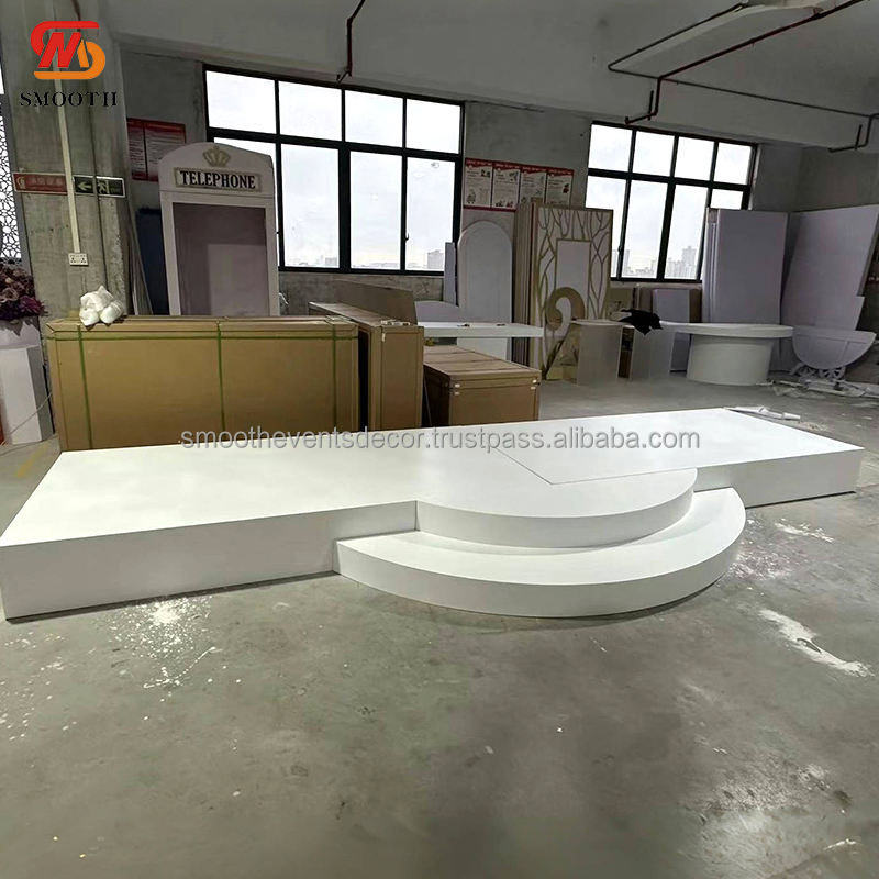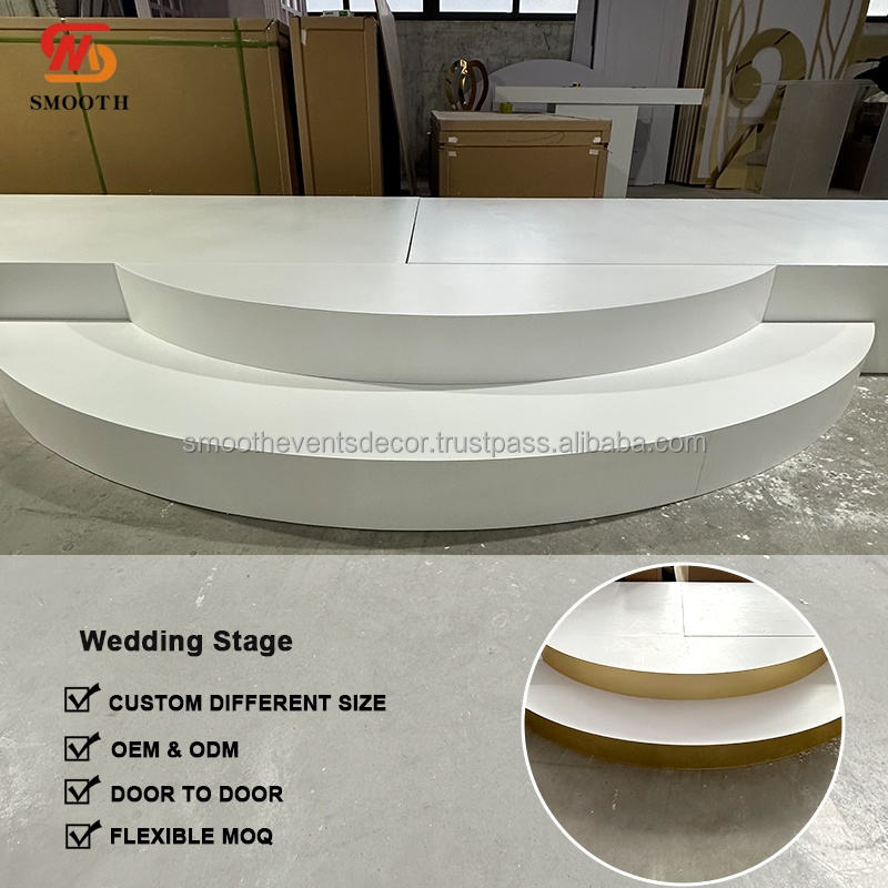 เวทีสีขาวพร้อมบันไดอะคริลิคสีทองชื่อผลิตภัณฑ์