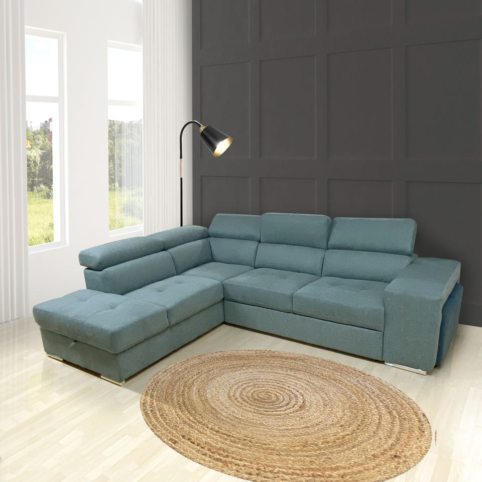ห้องนั่งเล่นโซเฟียพร้อมมุมเก็บของด้านซ้าย หุ้มผ้าสีเขียวอ่อนและสีเขียวเข้ม