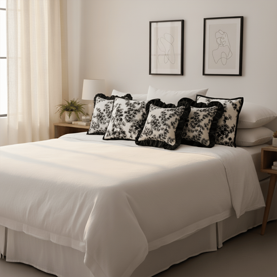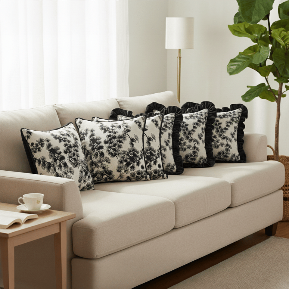 SOGA ชุดปลอกหมอนลายดอกไม้สีดำและสีขาวขนาด 45 ซม. 6 ชิ้น พร้อมหมอนตกแต่งและเบาะรองนั่ง 2 ชิ้น