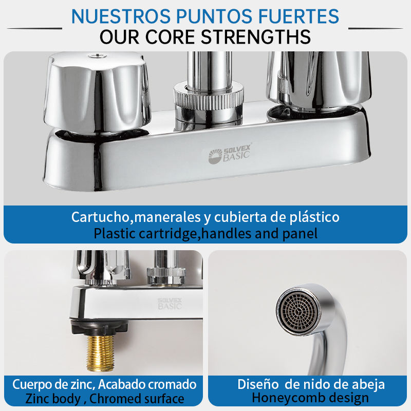 ก๊อกน้ำอ่างล้างหน้า SOLVEX 4 นิ้ว รุ่น Eco-Flow Duet แบบหมุนได้ 360 องศา ตัวก๊อกทำจากโลหะผสมสังกะสีที่ทนทาน พร้อมไส้กรองพลาสติก แบบก้านโยกเดี่ยว