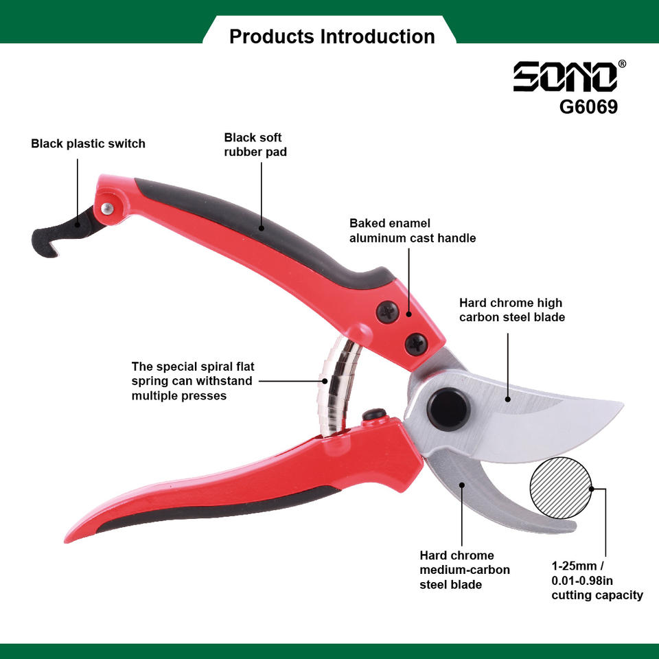 กรรไกรตัดแต่งกิ่ง SONO G6069 แบบพกพาสำหรับคนถนัดขวา วัสดุคาร์บอนสตีลและอะลูมิเนียมอัลลอยด์ ชุบโครเมียม ด้ามจับกันลื่น TPR