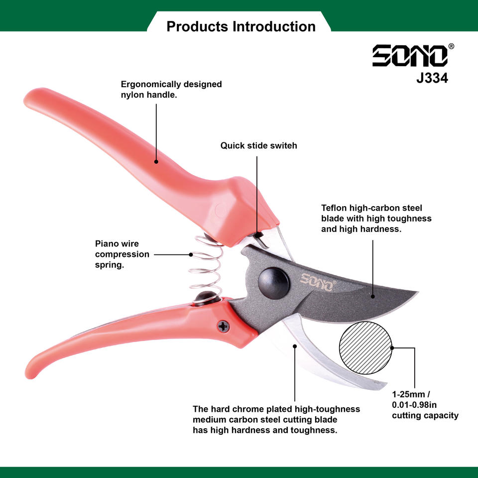 กรรไกรตัดกิ่ง SONO J334 แบบบายพาส ใบมีดเหล็กคาร์บอนเคลือบ PTFE ทนทาน ด้ามจับพลาสติก สำหรับคนถนัดขวา เหมาะสำหรับงาน DIY และงานอุตสาหกรรม