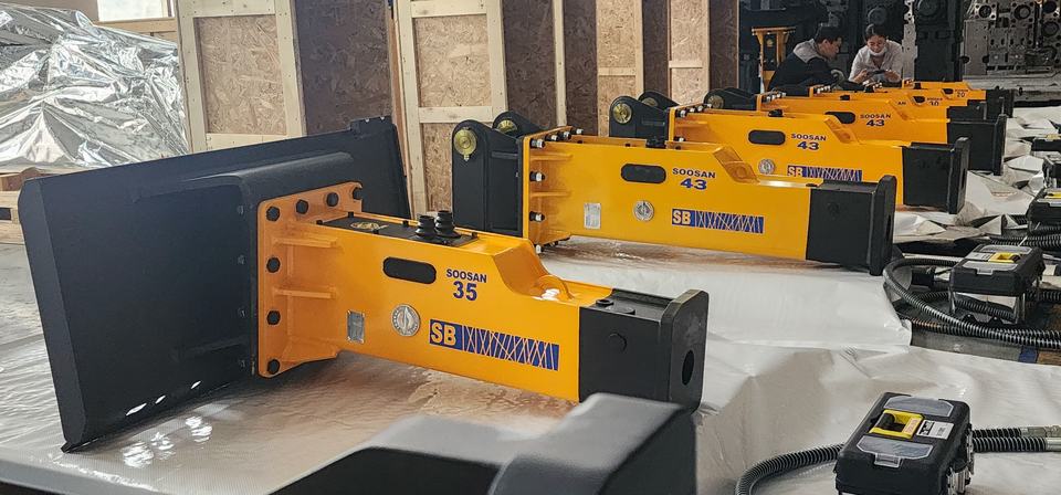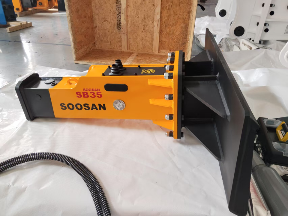 เครื่องเจาะไฮดรอลิกแบบเงียบ SOOSAN SB35 แบบกล่อง พร้อมอุปกรณ์ติดตั้งสำหรับรถตักล้อยางขนาดเล็ก อุปกรณ์ติดตั้งสำหรับรถขุดขนาดเล็ก รถตักล้อยางแบบมีที่ตักดินด้านหลัง