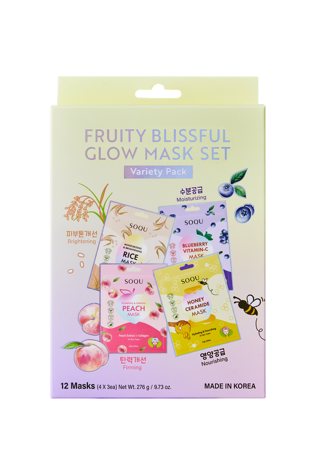ชุดมาส์กหน้า SOQU Fruity Blissful Glow 12 ชิ้น ส่วนผสมหลัก ข้าวและวิตามินซี