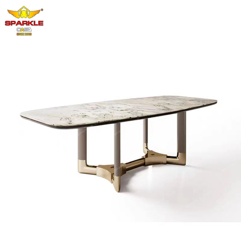 SPARKLE High End ออกแบบใหม่สแตนเลสขาโลหะโต๊ะรับประทานอาหารหุ้มหนังรอบโต๊ะรับประทานอาหารหรูหราที่กําหนดเอง