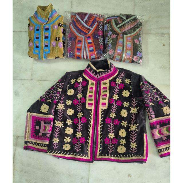 เสื้อแจ็คเก็ตกำมะหยี่ปักลายซูซานีแบบกลับด้านได้สำหรับผู้หญิง แบรนด์ SR Exports งานแฮนด์เมดสไตล์วินเทจโบโฮ ลายดอกไม้สไตล์ชาติพันธุ์