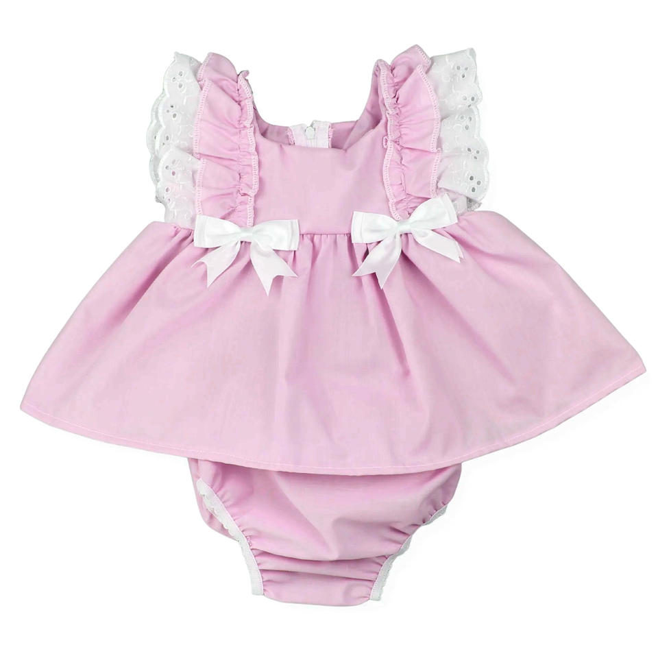 ชุดรอมเปอร์เด็กทารก SR4144 สีชมพูพิมพ์ลายโบว์สีขาว แขนบาน ชุดนอนเด็กผู้หญิง ขายส่ง