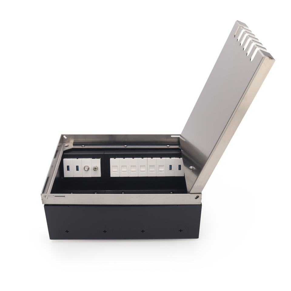 กล่องติดตั้งบนพื้น SS304 พร้อมฝาปิดแบบฝัง ช่องเสียบไฟและข้อมูล สำหรับพื้นที่ที่เปียกชื้น