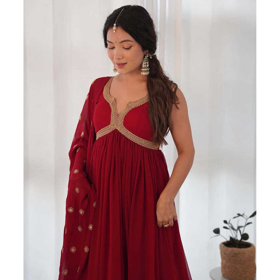 ชุดเดรสออกงานพร้อมกระโปรงสีแดงเข้ม รุ่น SSR Designer สำหรับงานพรอม ไซส์ M