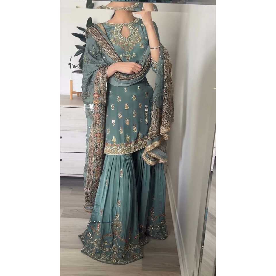 ชุดเซ็ตเสื้อสีน้ำเงินพร้อมกางเกงพลัสโซ่และผ้าคลุมไหล่สำหรับผู้หญิง SSR ตกแต่งด้วยงานปักอย่างประณีต เหมาะสำหรับงานปาร์ตี้
