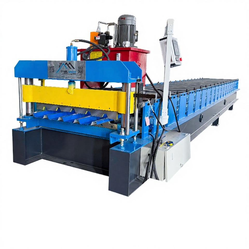 เครื่องขึ้นรูปลอนหลังคาทรงสี่เหลี่ยมคางหมู STEELMAMA รุ่น 686 แบบอัตโนมัติเต็มรูปแบบ ควบคุมด้วย PLC ระบบไฮดรอลิก ทนทาน พร้อมมอเตอร์