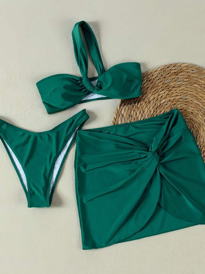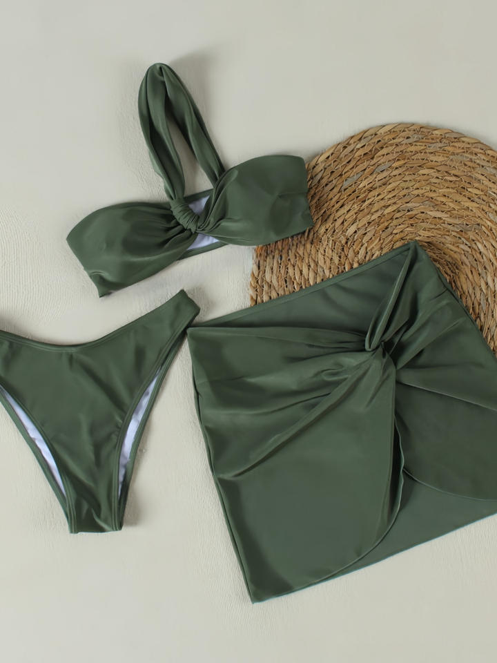 ชุดว่ายน้ำสตรี3ชิ้น7สีชุดบิกินี่และกระโปรงสไตล์บราซิลชุดบิกินี่และกระโปรงพันตัวหนึ่งไหล่ชุดว่ายน้ำมินิกระโปรงคลุม