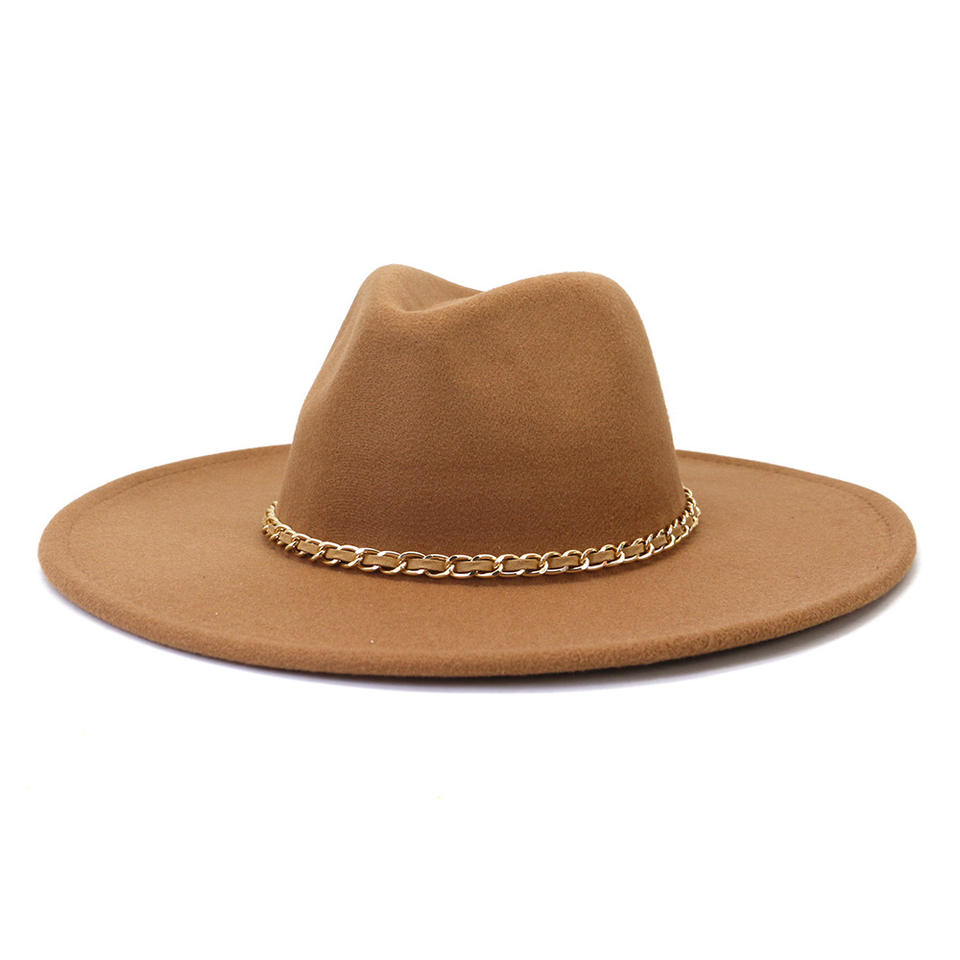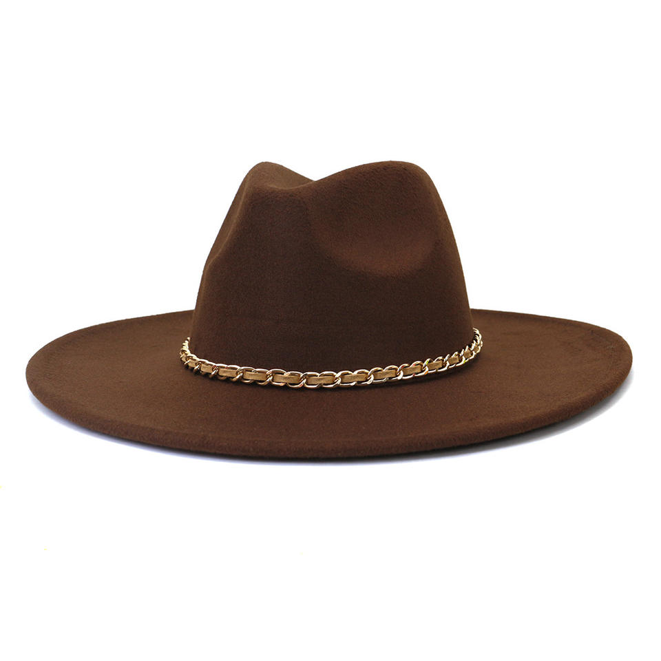 หมวกเฟโดราหนังกลับหลากสี SU24 ปีกกว้างแบน ตกแต่งด้วยโซ่โลหะสีกากี สำหรับงานปาร์ตี้และการเดินทาง