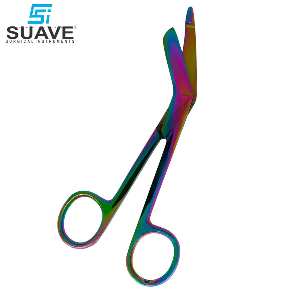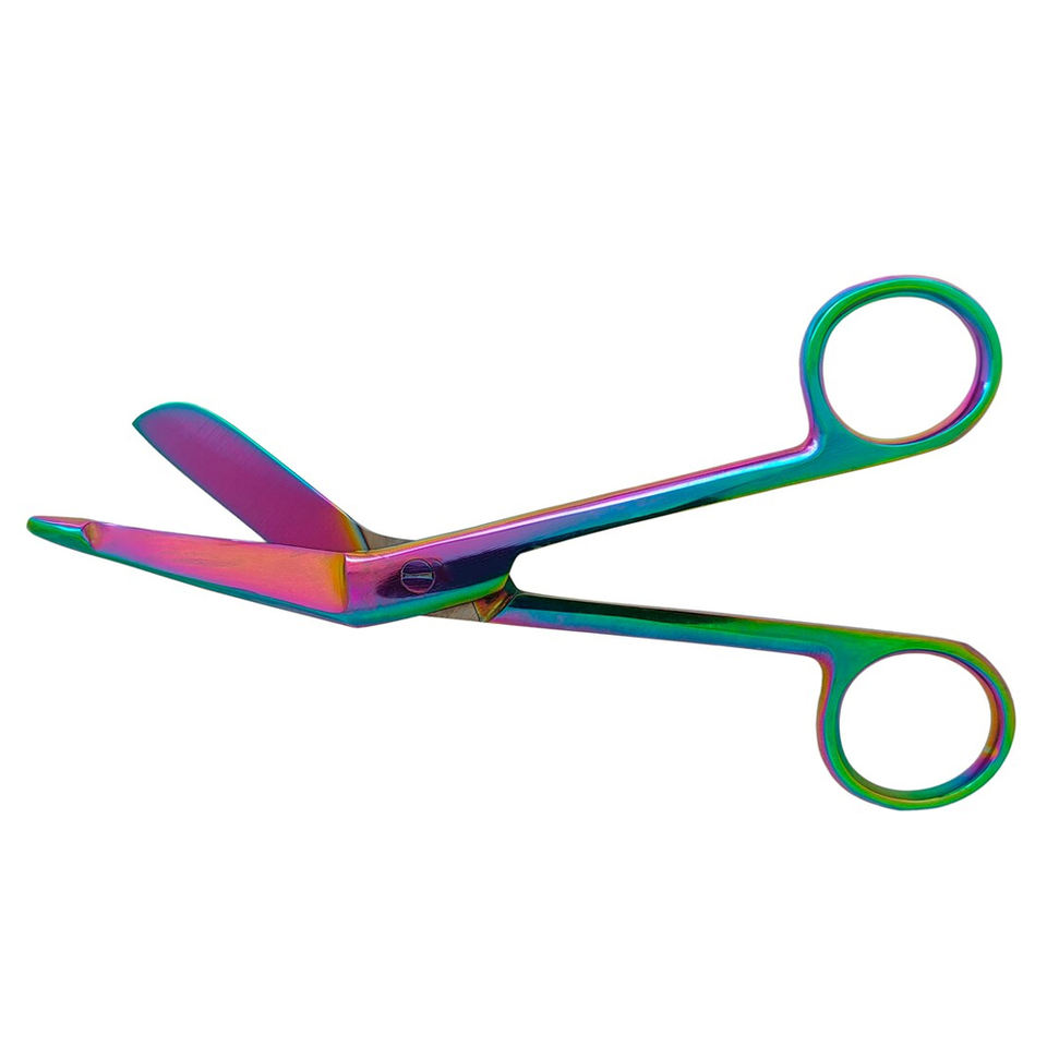 กรรไกรตัดผ้าพันแผลสแตนเลสทำมือชุดเครื่องมือสีรุ้งทำจากพลาสติกสำหรับใช้ในโรงพยาบาล