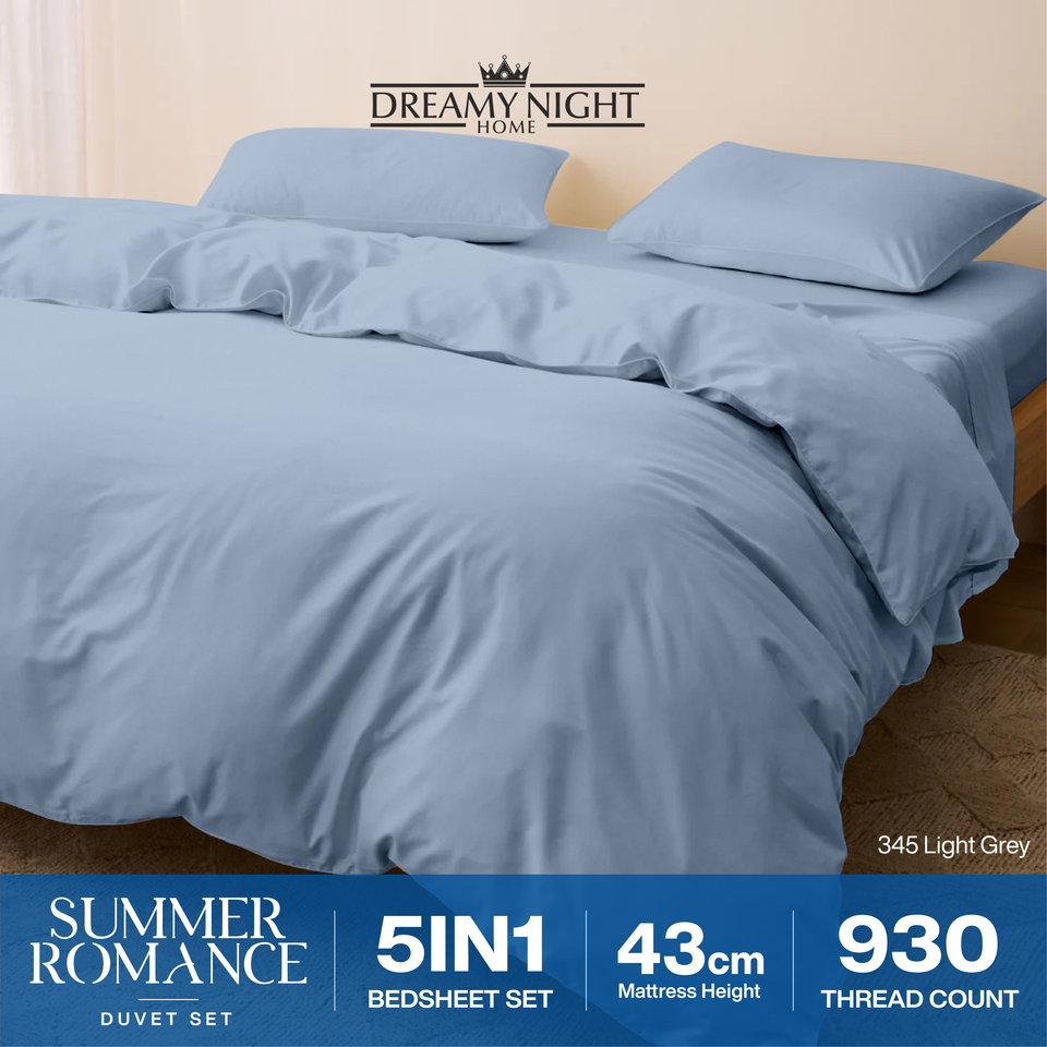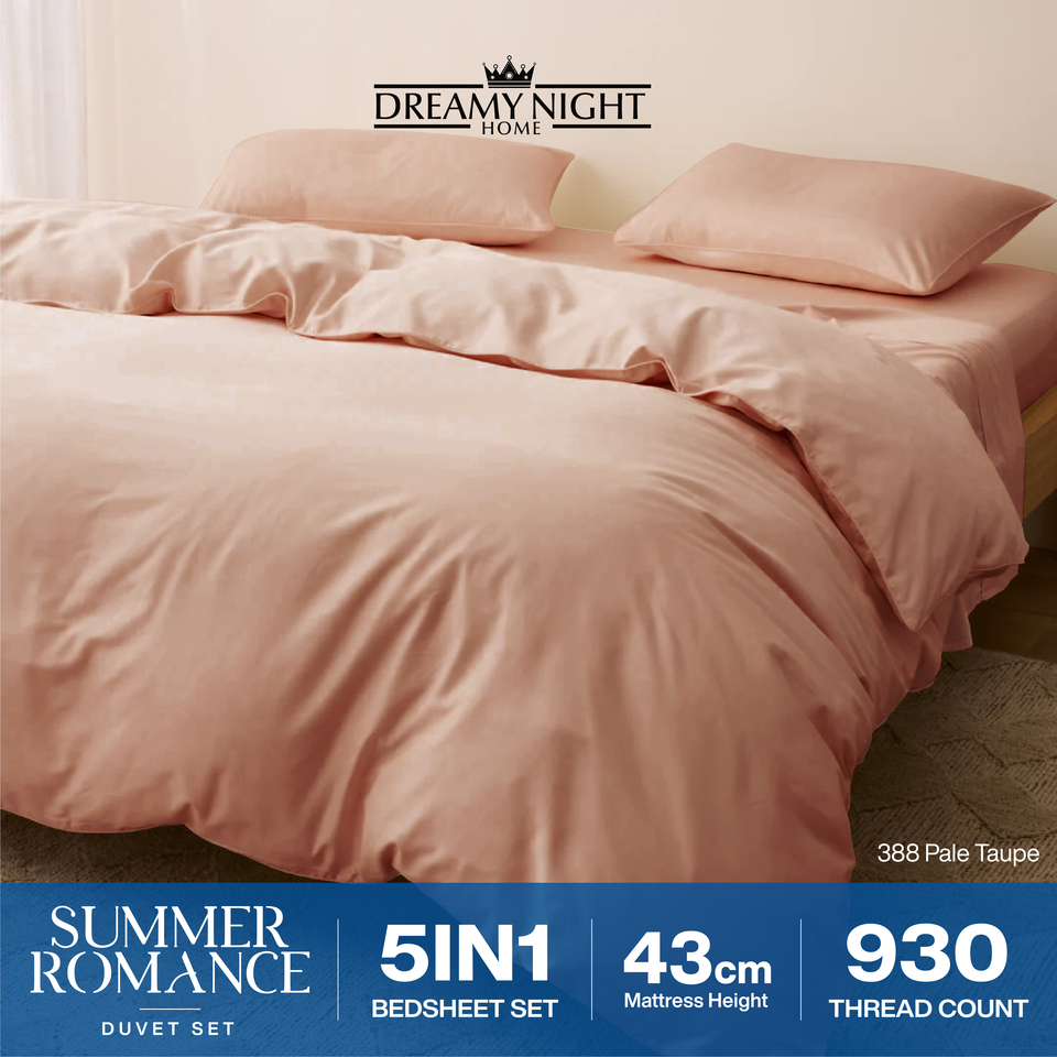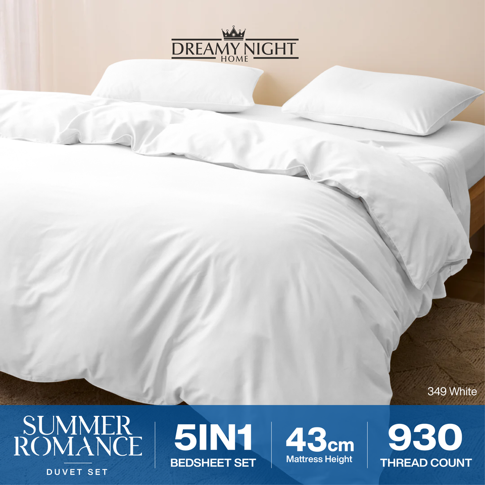 ชุดผ้าห่มคิงไซส์ ซัมเมอร์ โรแมนซ์ โมเดิร์น 930TC ผ้าฝ้ายทอเนื้อแน่น | ชุดเครื่องนอนพรีเมียม 5 ชิ้น เนื้อผ้านุ่มพิเศษ พร้อมผ้าปูที่นอนแบบรัดมุม ความลึก 43 ซม.