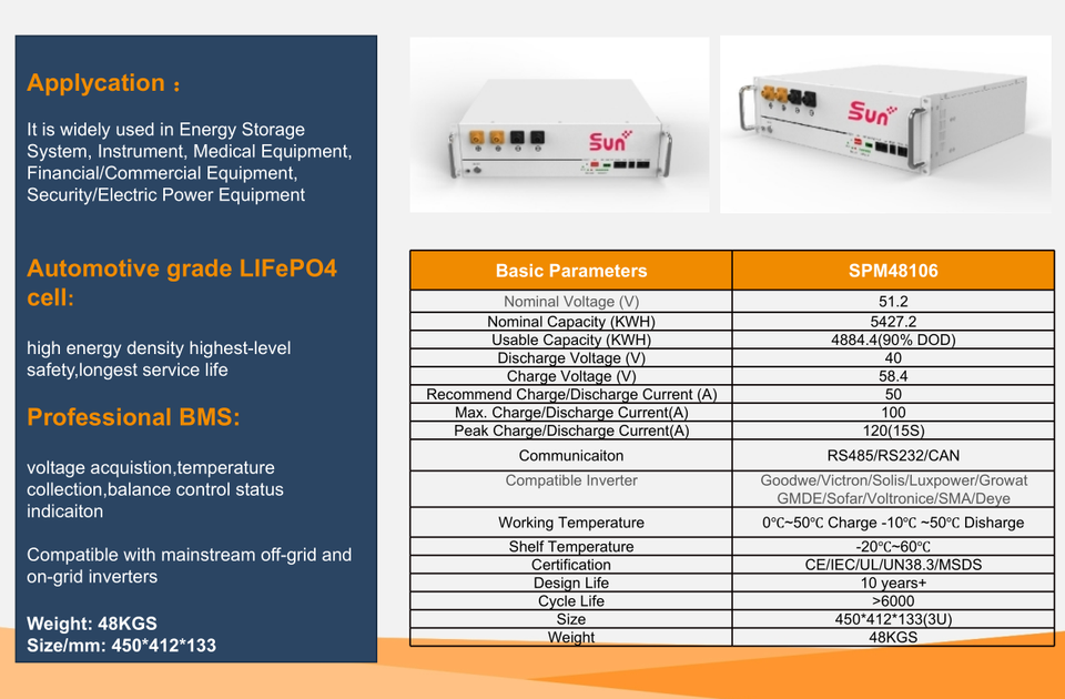 Sunplus แบตเตอรี่ลิเธียมไอออนฟอสเฟต LiFePO4 100Ah 24V 48V ที่ใช้งานได้ยาวนานเหมาะสำหรับระบบพลังงานแสงอาทิตย์ออฟกริด