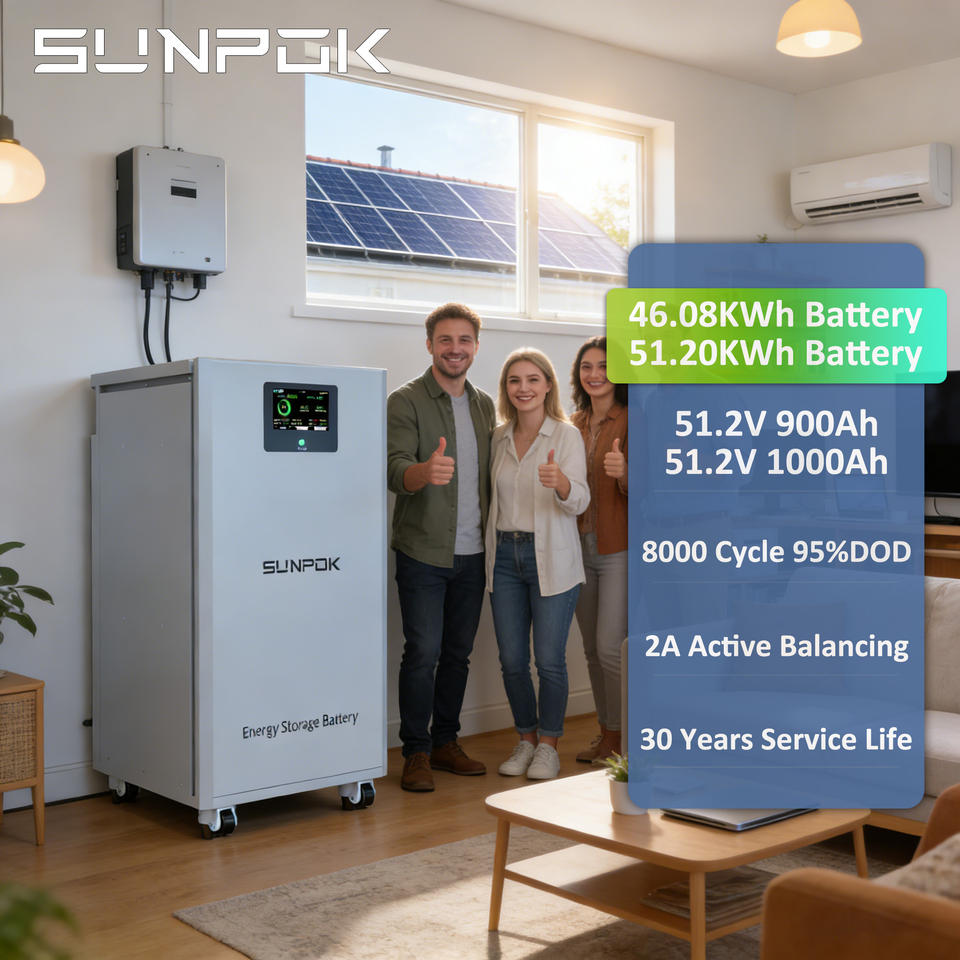 แบตเตอรี่ลิเธียม SUNPOK 50 กิโลวัตต์ชั่วโมง 48 โวลต์ ระบบกักเก็บพลังงานภายในบ้าน 51.2 โวลต์ 900 แอมป์ชั่วโมง 1000 แอมป์ชั่วโมง แบตเตอรี่โซลาร์ Lifepo4 พร้อมระบบ BMS