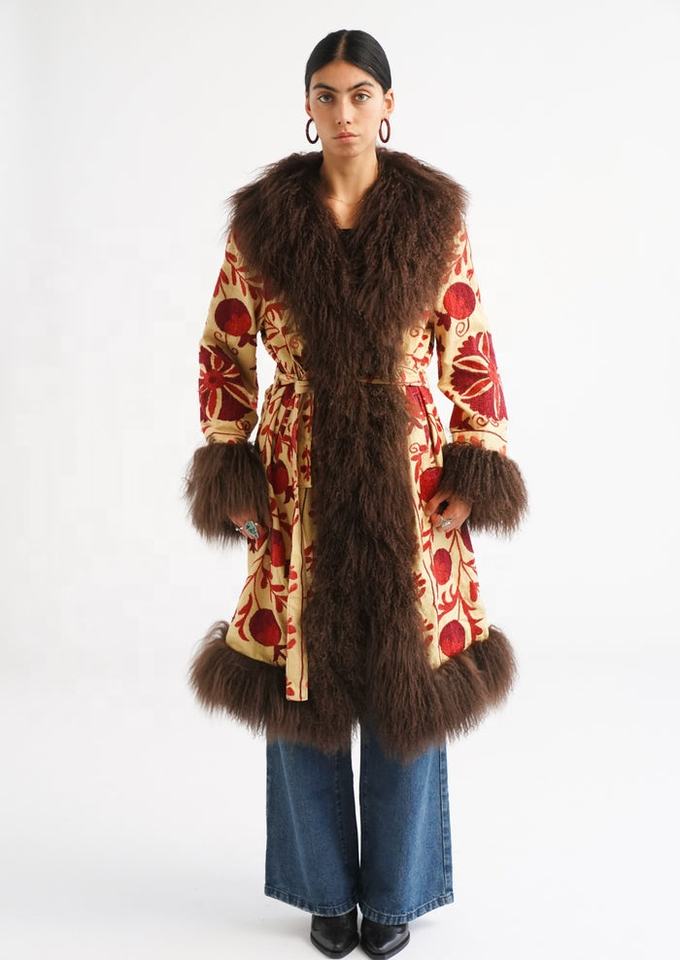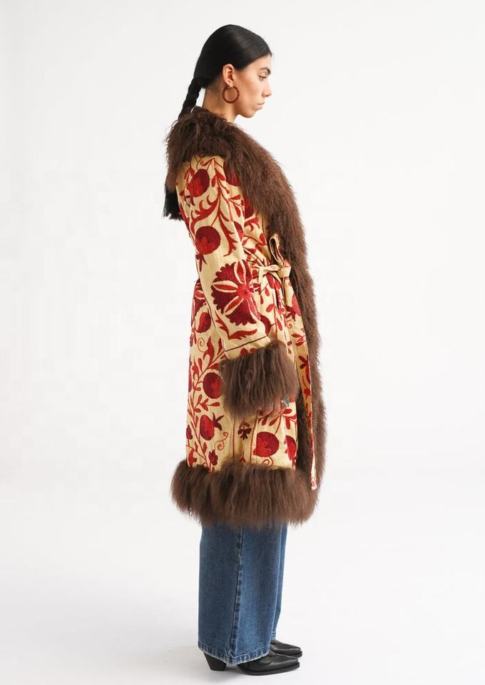 Suzani เสื้อโค้ทขนสัตว์เทียมยาวขนเฟอร์เทียมปักลายสำหรับผู้หญิงใหม่สำหรับฤดูหนาว