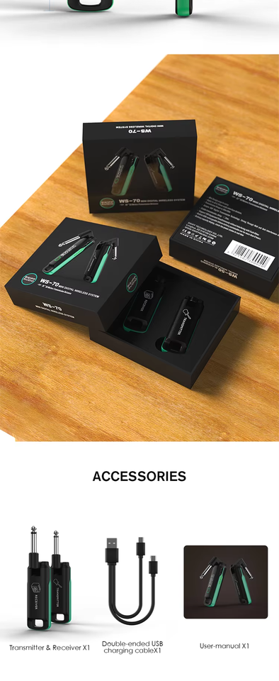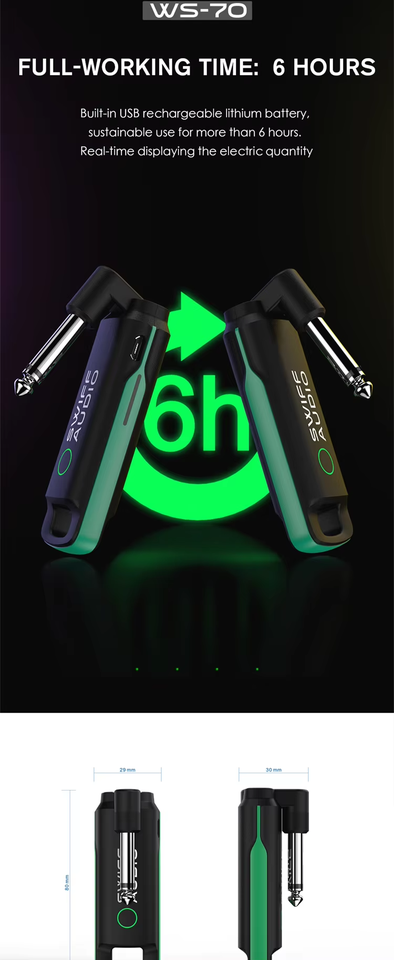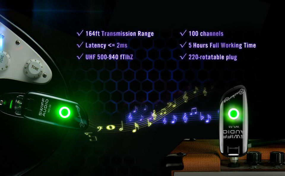 ระบบกีตาร์ไร้สายดิจิตอลแบบชาร์จไฟได้ SWIFF WS-70 รุ่นใหม่ เครื่องส่งสัญญาณเสียงและตัวรับสัญญาณสำหรับเครื่องดนตรีเบส พร้อมปิ๊กและแอมป์