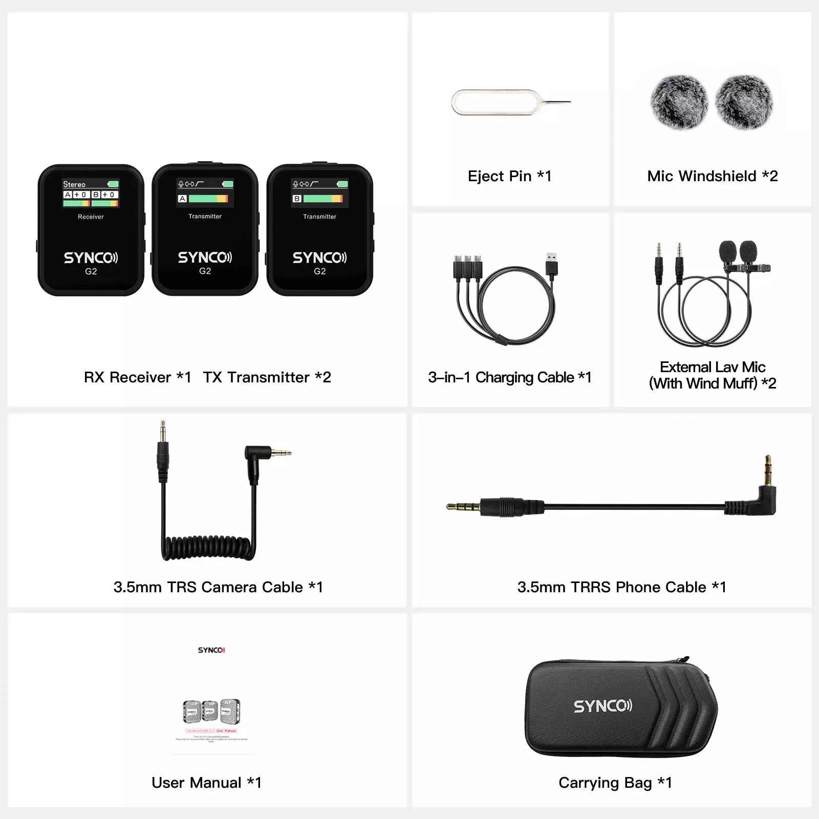 ระบบไมโครโฟนไร้สาย SYNCO G2A2 Lavalier 2.4G แบบคู่ พร้อมตัวรับสัญญาณ 1 ตัว ไมโครโฟนแบบหนีบปกเสื้อ 2TX 1RX