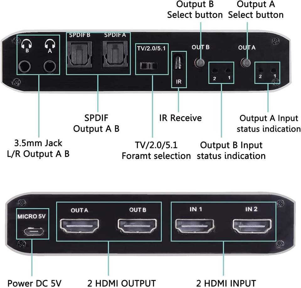 Syong 2x2 HDMI Matrix Switcher สวิตช์วิดีโอ4K60Hz 2 IN 2 OUT Splitter สนับสนุน Optical และ3.5MM 3D สัญญาณเสียง, 2.0B HDMI