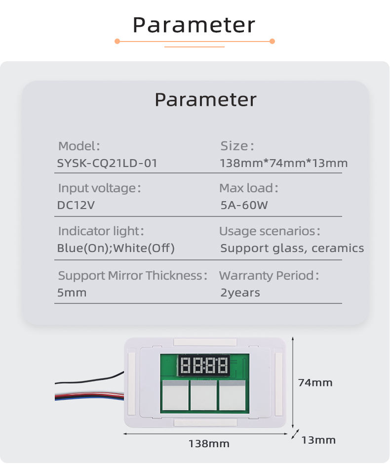 SYSK-CQ21LD-01 กระจกสองสีคุณภาพสูง 5A 60W ป้องกันฝ้า พร้อมจอแสดงผลเวลาและอุณหภูมิ สวิตช์ควบคุมแบบแมนนวล เซ็นเซอร์เรดาร์ ปรับความสว่างได้ DC12V