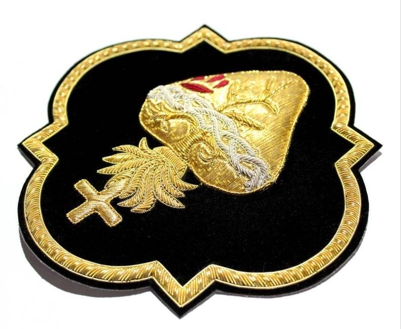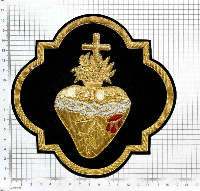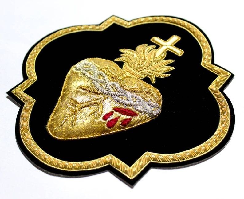 ศิลปะการปะติดรูปหัวใจศักดิ์สิทธิ์สำหรับเสื้อคลุมคาทอลิกบนกำมะหยี่สีดำ