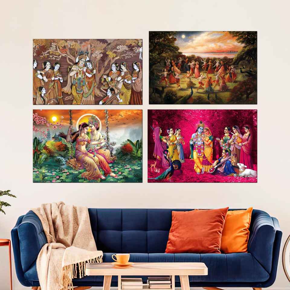 ชุดงานศิลปะติดผนังฮินดูเรื่องพระราชาคริชนา - ชุดภาพพิมพ์บนผ้าใบตกแต่งผนัง ชุด 4 ชิ้น แกลเลอรี WR