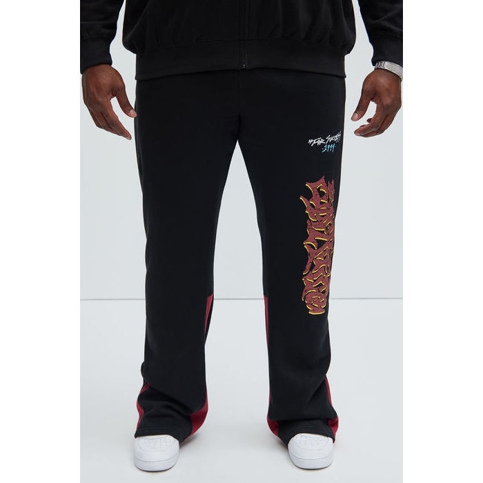 กางเกงวอร์มขาบานแฟชั่นสีดำสำหรับผู้ชายกางเกงขาบานพิมพ์ลายผ้าทรงหลวมขาบานเข้ารูป