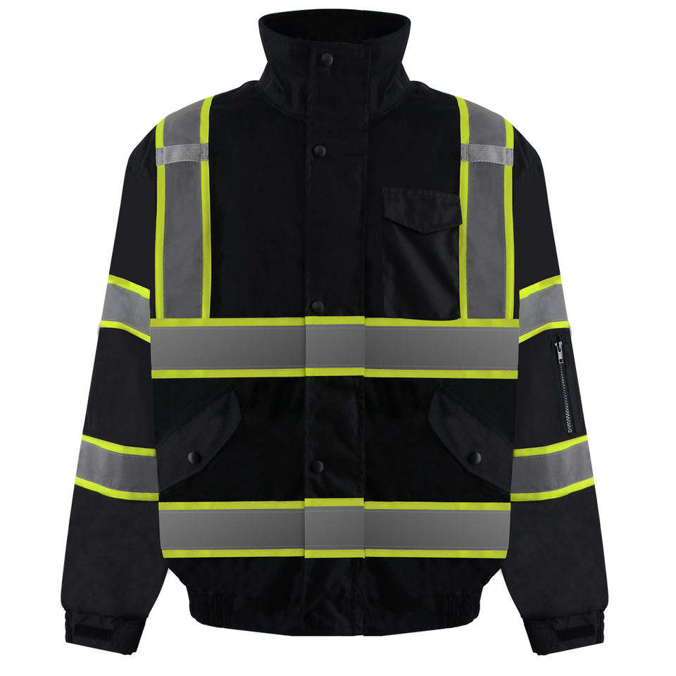 เสื้อแจ็กเก็ตบอมเบอร์แบบ High VIS สำหรับคนงานก่อสร้างเสื้อแจ็กเก็ตเครื่องแบบการก่อสร้างตามสั่งมีคอตั้ง
