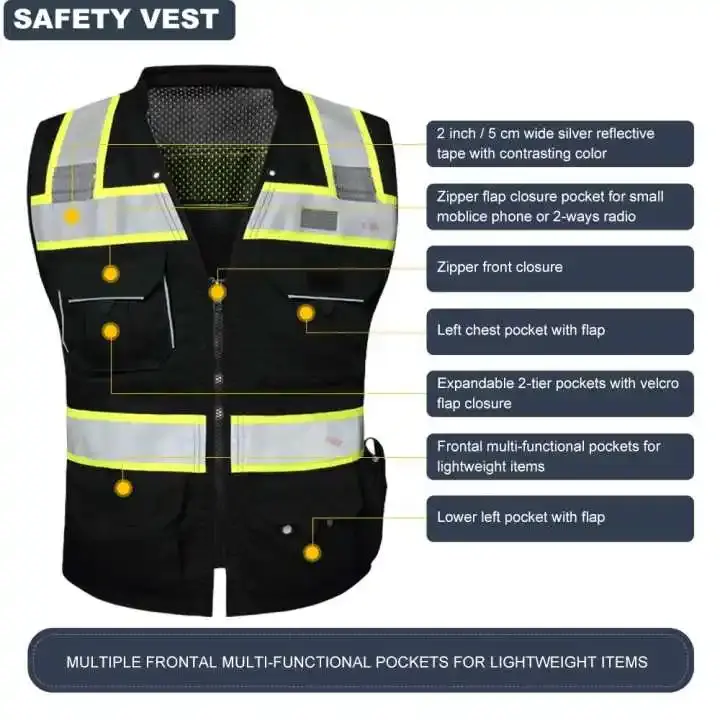 เสื้อกั๊กนิรภัยสะท้อนแสงสะท้อนแสงสำหรับงานอุตสาหกรรมเสื้อกั๊กนิรภัยแบบกระเป๋าตาข่ายสะท้อนแสงมองเห็นได้ชัดเจน