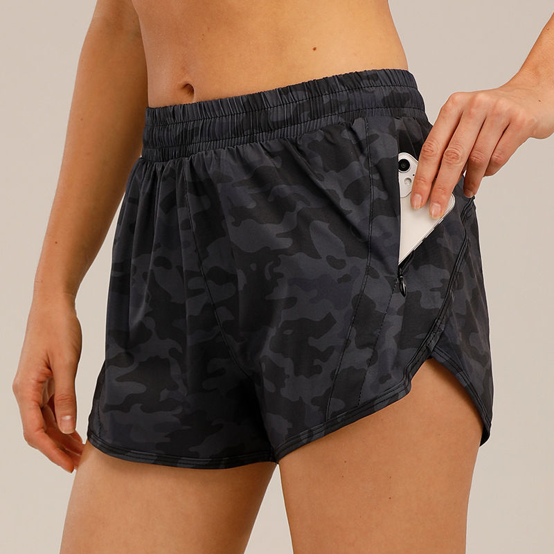 กางเกงขาสั้นเอวสูงสำหรับผู้หญิงสำหรับวิ่งและขี่จักรยานกางเกงขาสั้นสองชั้นป้องกันการเสื่อมเสียพร้อมเทคนิคปักระบายอากาศ
