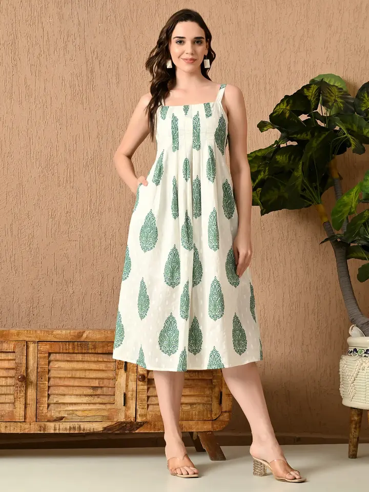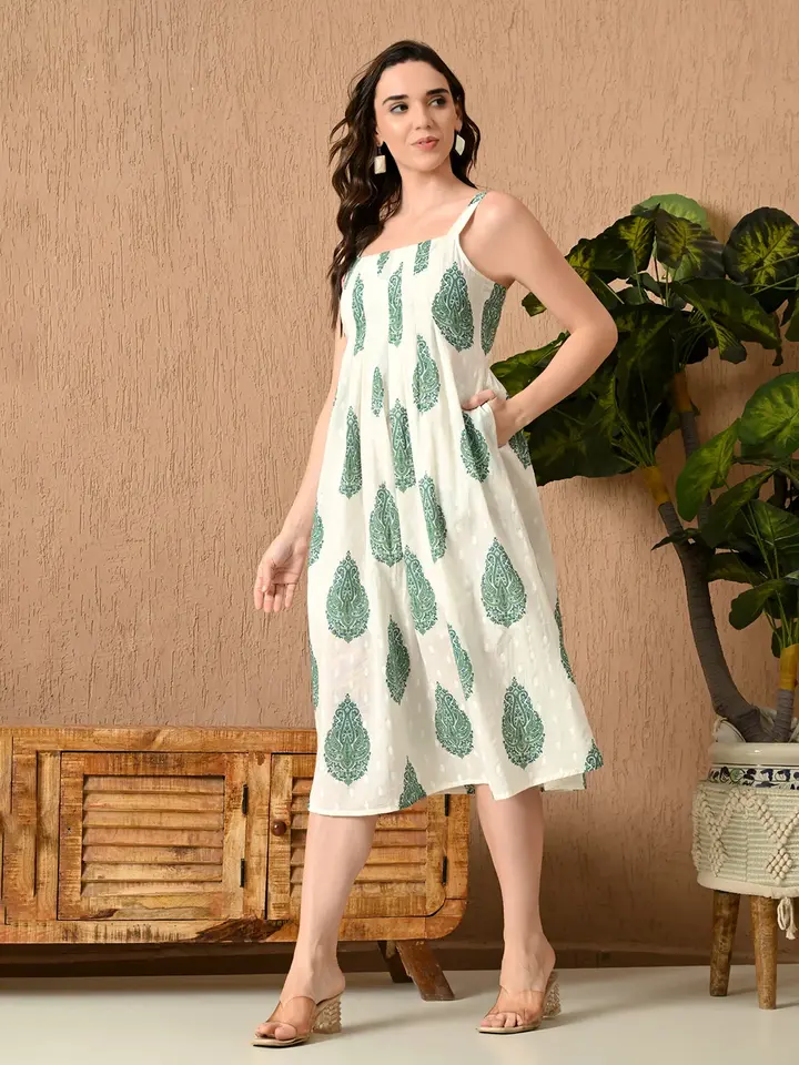 Sage Breeze Strappy Midi Dress Solid Floral Printed Cotton Traditional Craftsmanship Modern Style Vintage A-Line 100% Cotton