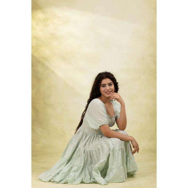 เดรสสีเขียวเซจทรงเอ สไตล์สโมค แขนพองระบายเป็นชั้นๆ ผ้าฝ้าย 100% คอวี ทรงเอไลน์ เป็นมิตรต่อสิ่งแวดล้อม เหมาะสำหรับใส่ไปงานบรันช์ในฤดูร้อน
