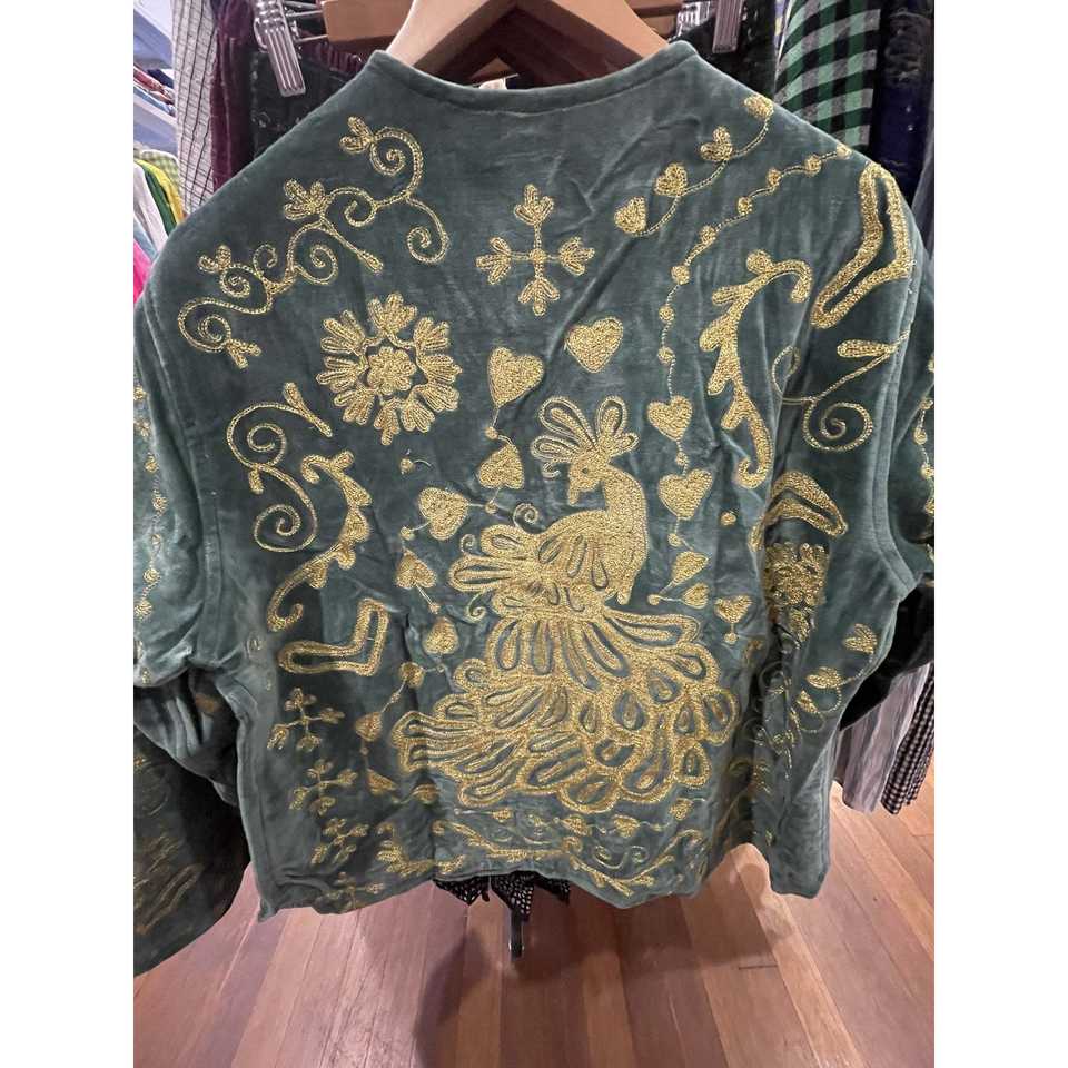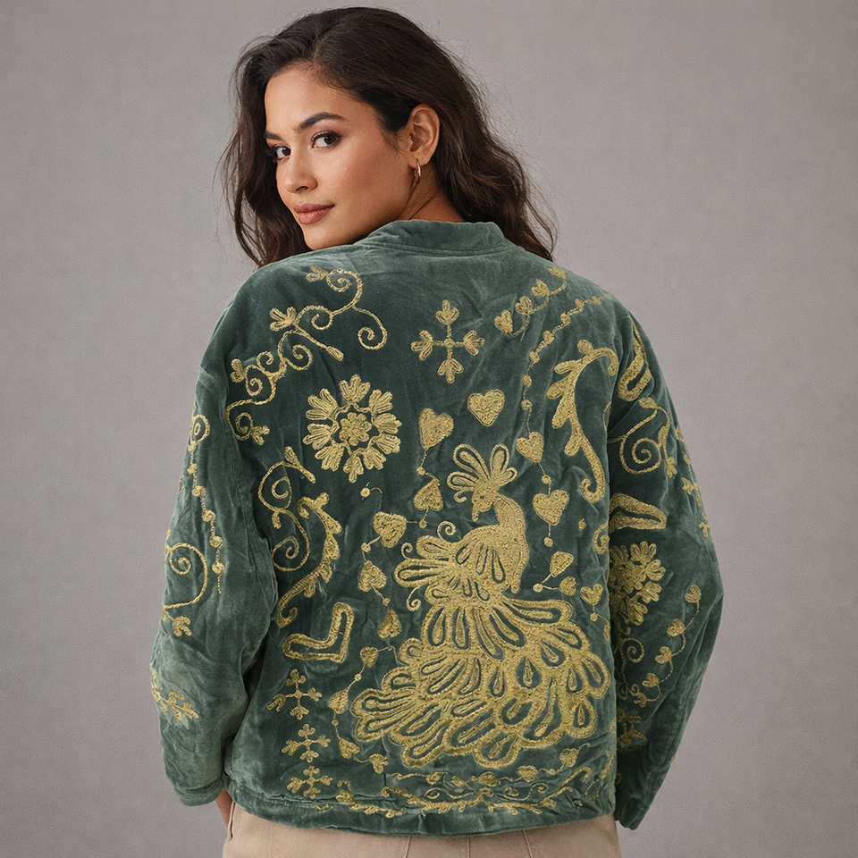 Green Velvet Autumn Jacket Reversible Quilted Sheep Skin Leather Custom Logo Floral Boho Outerwear Full Sleeve O-Neck Collar