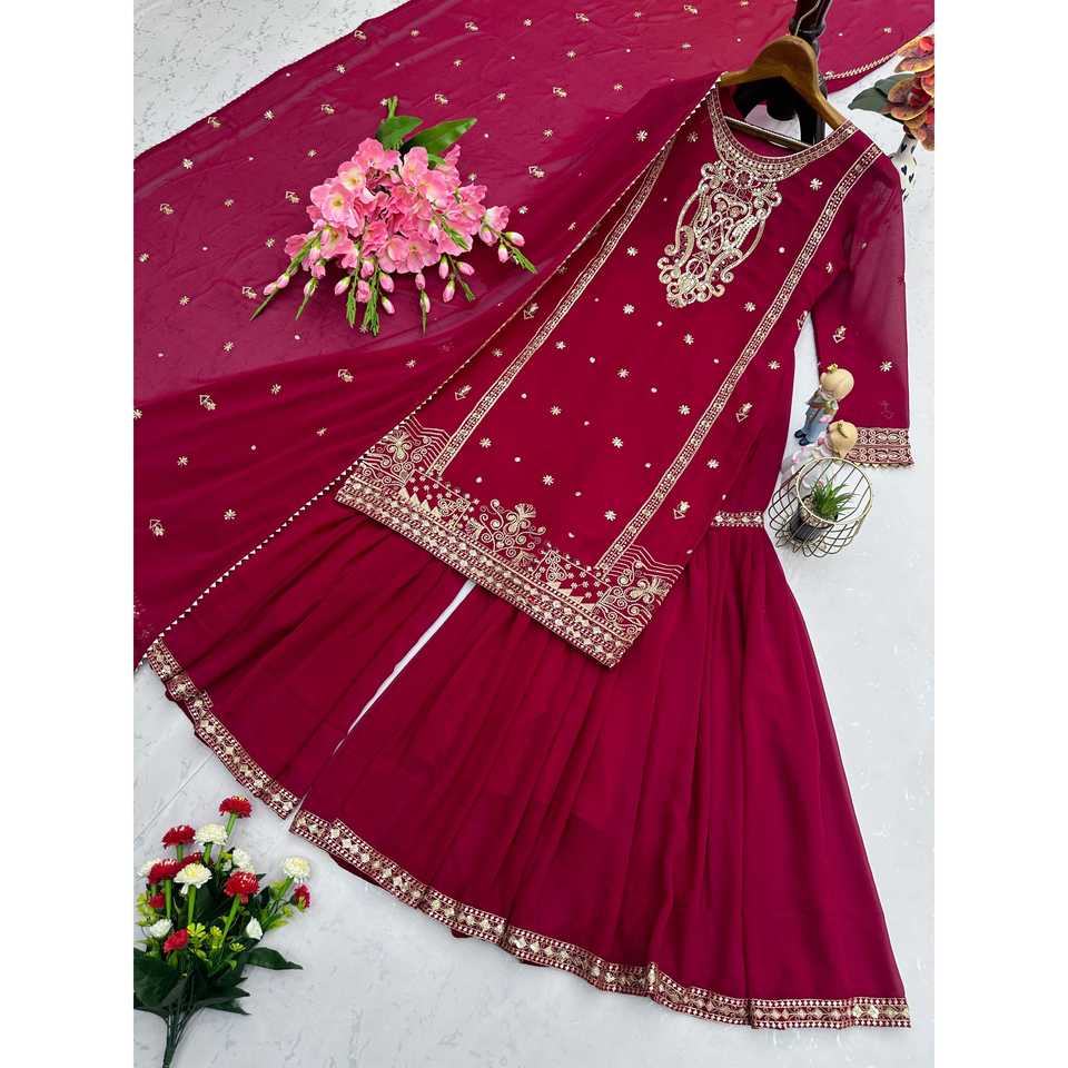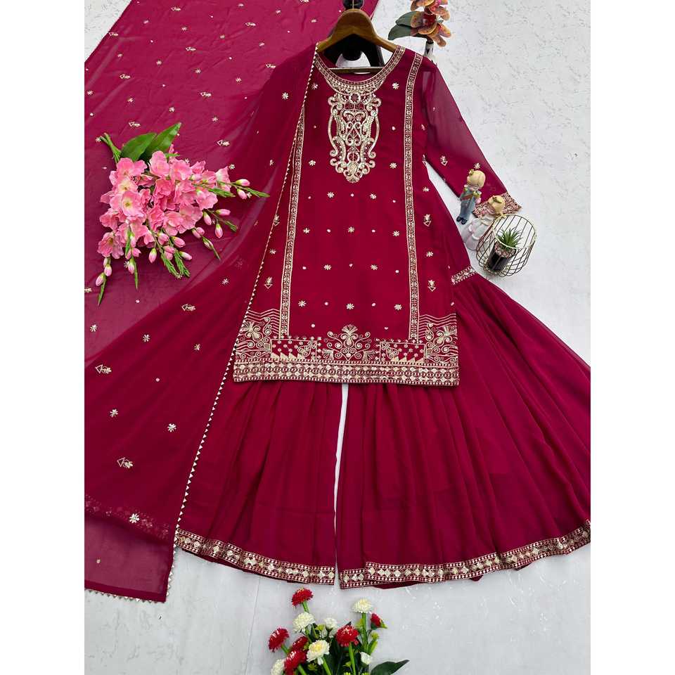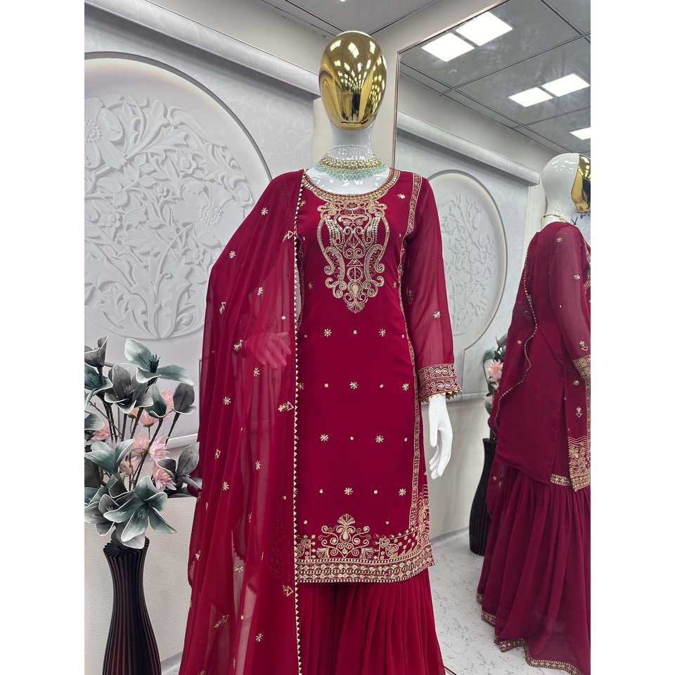 ชุดส่าหรีสีแดงผ้าโพลีเอสเตอร์ ดีไซน์สวยงามจาก Sai Creation เหมาะสำหรับงานปาร์ตี้ พร้อมเสื้อท่อนบน ชาราร่า และผ้าคลุมไหล่ ไซส์ M