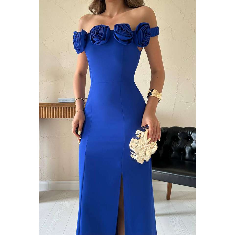 ชุดราตรีทรงเข้ารูปประดับดอกกุหลาบแบบเปิดไหล่ แบรนด์ Saks รุ่น Natural Waist สีน้ำเงินผ้าซาติน