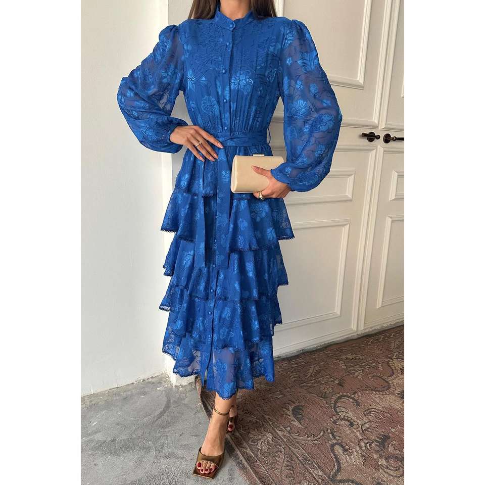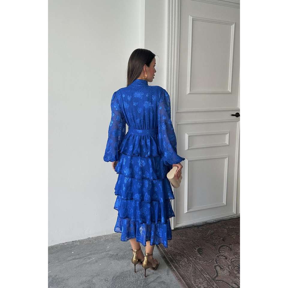 ชุดเดรสชีฟองสีน้ำเงิน Saks Valon แบบมีระบาย คอสูง ทรงเอไลน์ ผ้าซีทรู ชุดราตรี